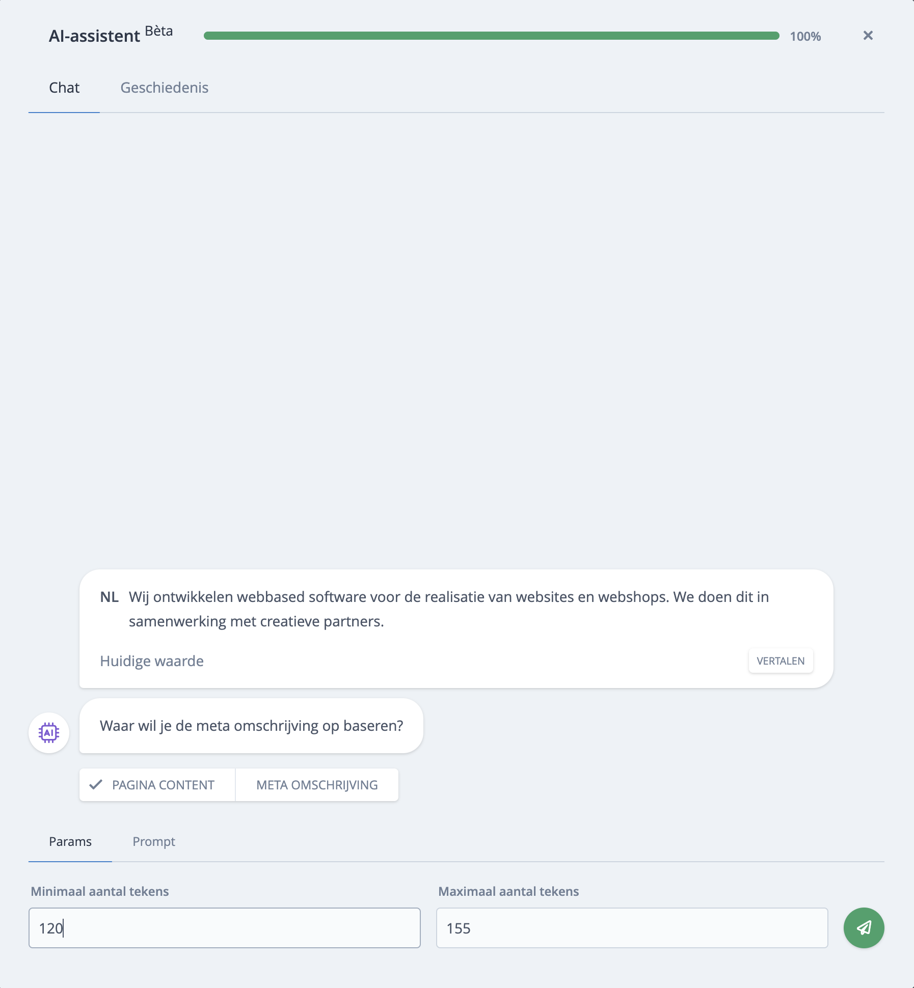 Met de AI-assistent kun je op basis van de pagina-content de meta-description generen. Bladsites haalt alle tekstuele content van de pagina en stuurt deze door de AI-engine. De AI-engine retourneert vervolgens de meta-description. Je kunt de content vervolgens door de AI-engine laten vertalen naar alle gewenste talen.