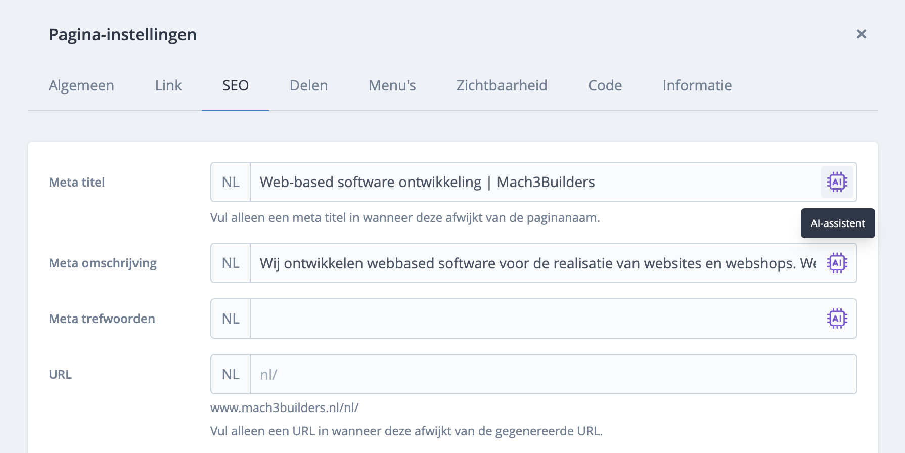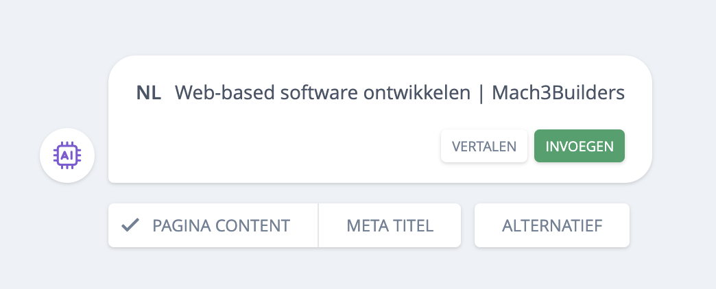 Met de AI-assistent kun je op basis van de pagina-content de meta-titel generen. Bladsites haalt alle tekstuele content van de pagina en stuurt deze door de AI-engine. De AI-engine retourneert vervolgens de meta-titel.