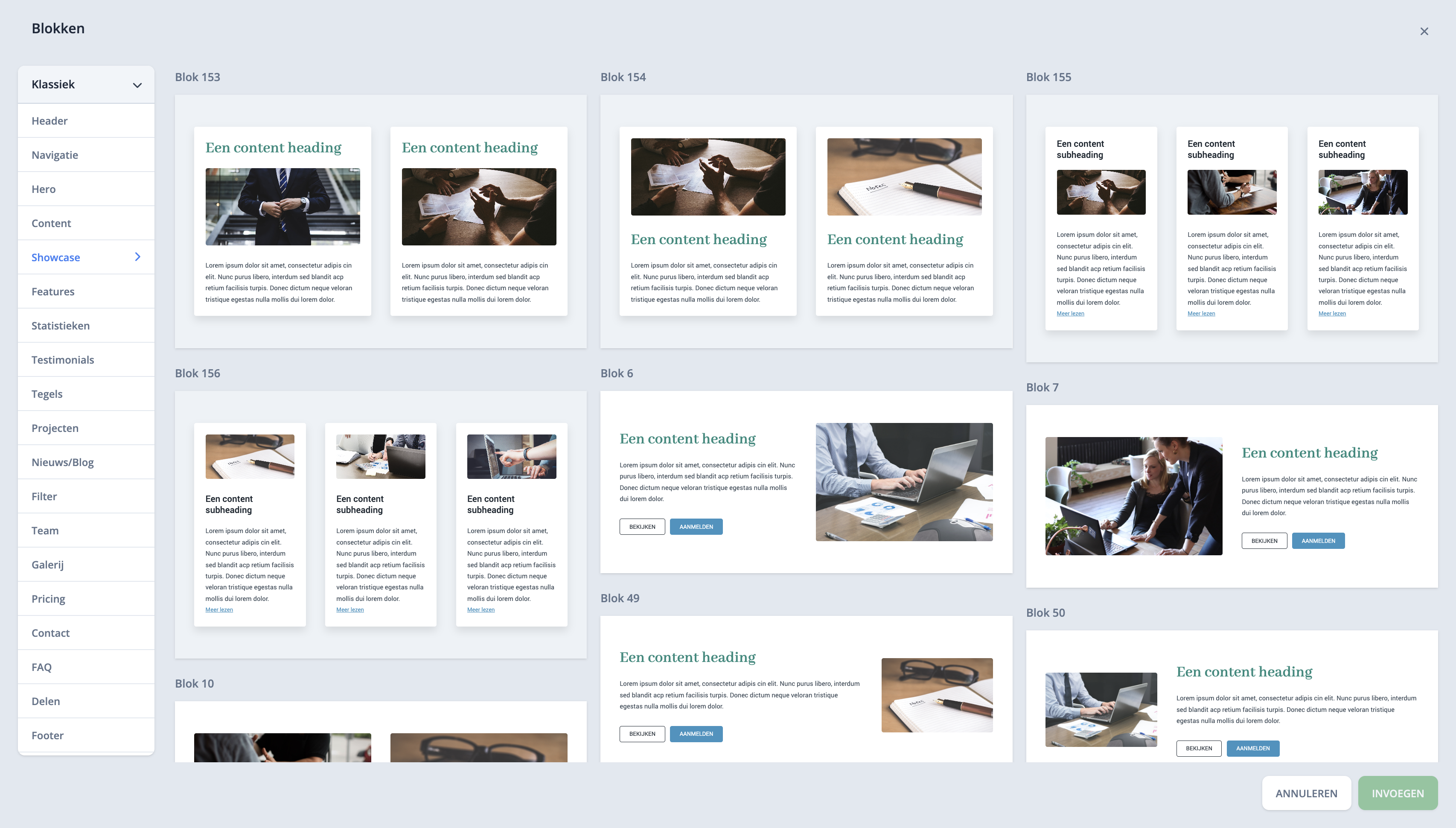 Bladsites bevat een groot collectie met kant-en-klare blokken. Bouwen met blokken is de meest efficiente manier om websites te bouwen. Door gebruik te maken van kant-en-klare blokken kun je snel websites bouwen. Je hebt daarbij de zekerheid dat de verschillende blokken perfect werken op de diverse devices.