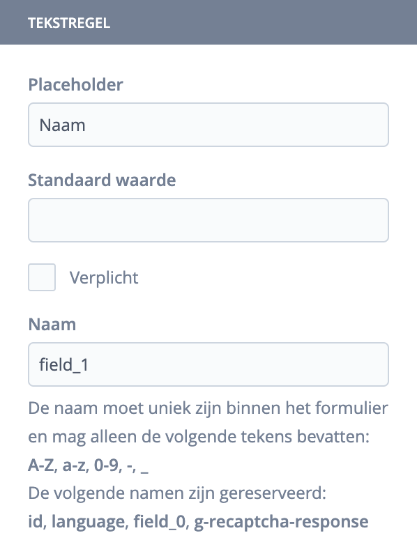 De veldnamen kunnen aangepast worden aan de wensen van de externe omgeving. Standaard is de veldnaam alsvolgt opgebouwd: field_{nummer}.