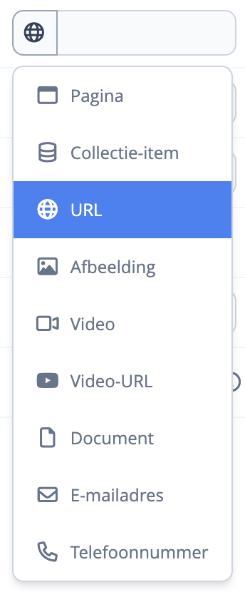 Over het algemeen is het niet verstandig om verkeer van je website weg te leiden naar andere websites. Soms is het echter nodig om links naar een andere website te leggen. Je kan in Bladsites externe links maken door type "URL" (met de wereldbol erbij) te selecteren.